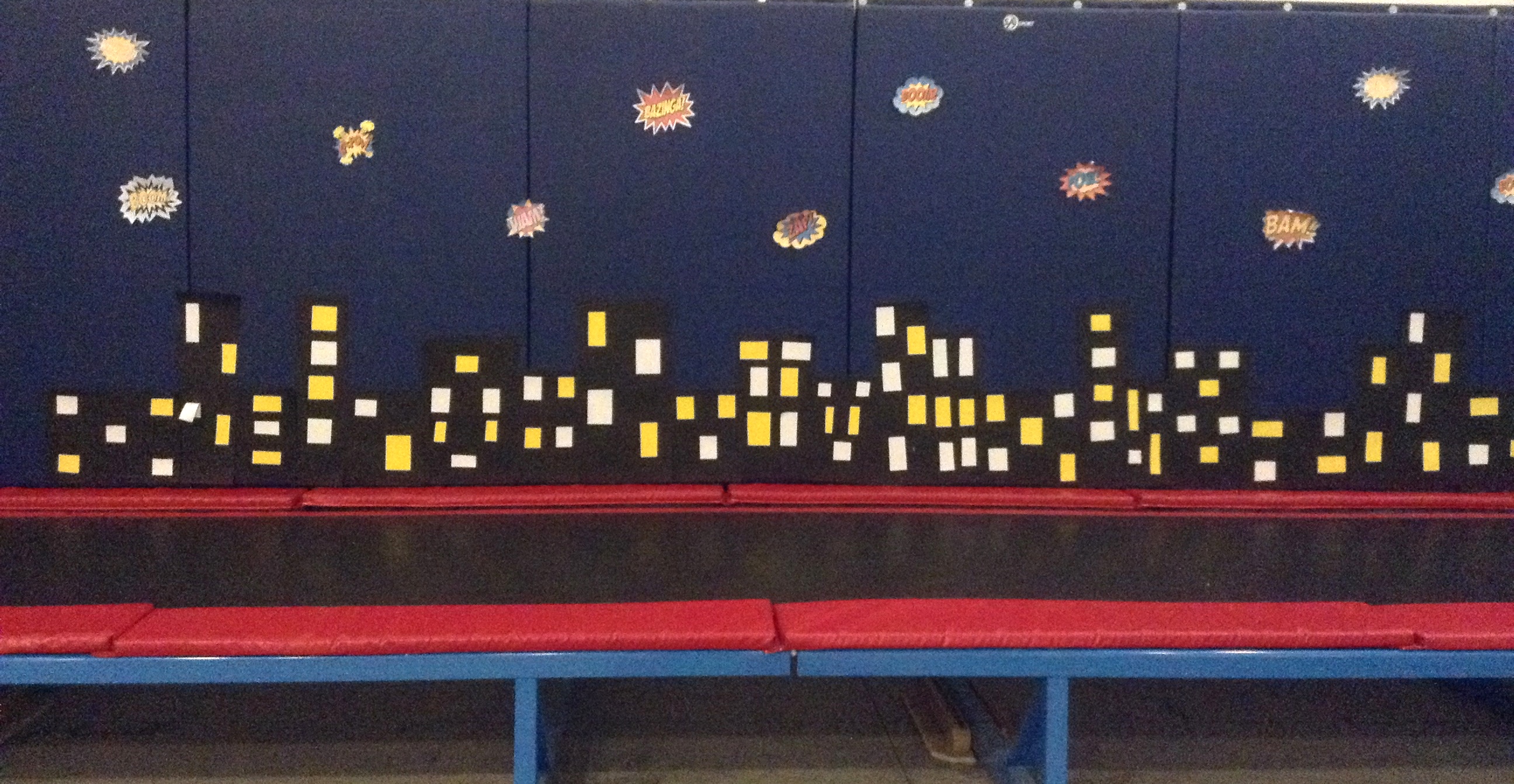 - Our Tumbl Trak decor was city buildings so that kids could jump over them, just like superheroes! We also had cutouts of sound effects like BAM! POW! BOOM!